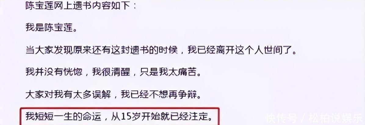 2002年7月31日,陈宝莲在上海静安区南阳路的家里,从二十四楼跳了下来。留下刚满月的宝宝,她选择了跟世间告别,享年29岁。一位曾风靡一时的“港台艳星”去世的消息,很快在香港娱乐圈里传开了,大家都在感叹怅然若失。后来记者找到陈母,把遗书的内容公布出来,一字一句地读着,简直让人忍不住流泪。